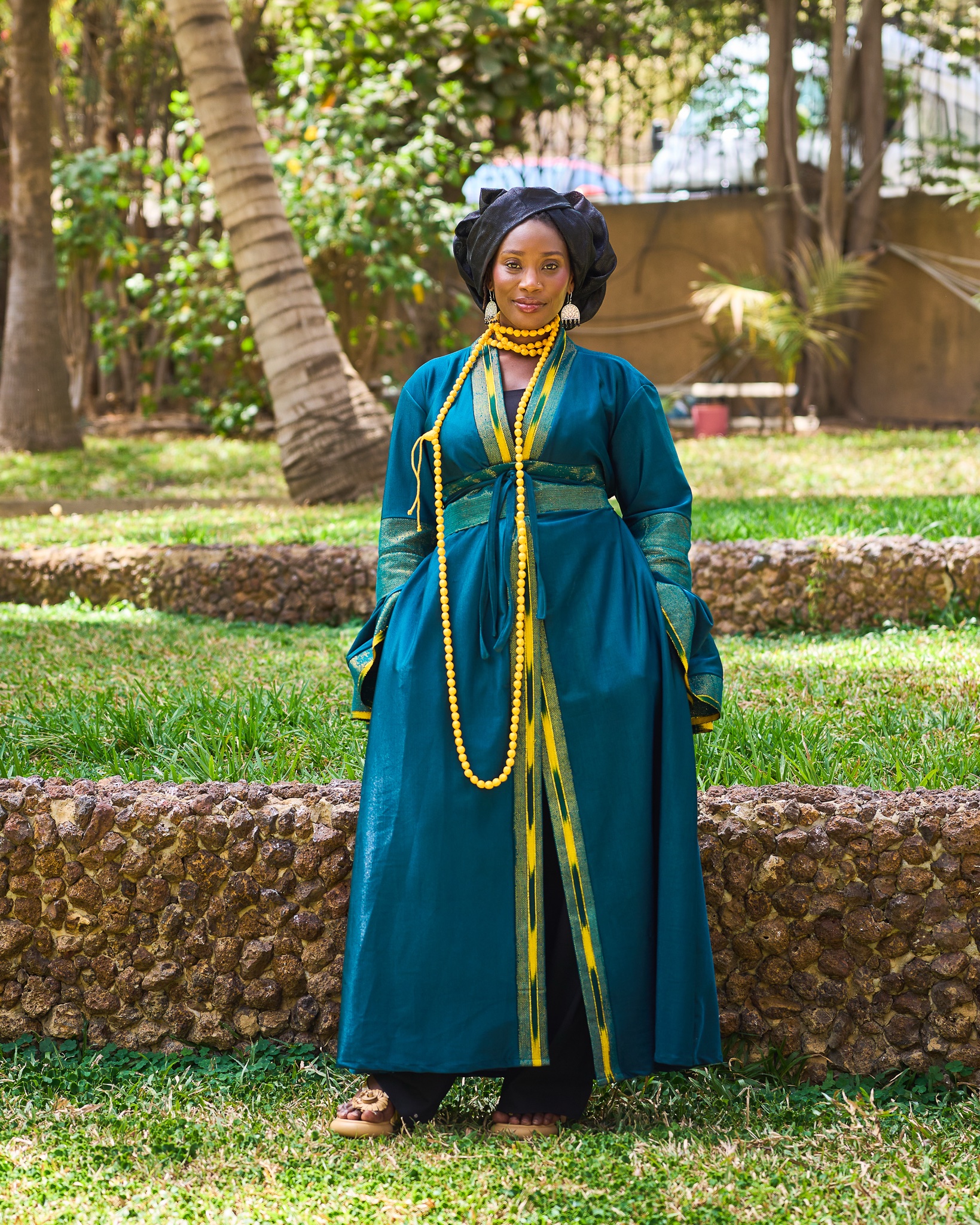 Ce kimono en tafta légèrement irisé est sublimé par de belles bandes de pagne tissé, pour une touche d’héritage et d’élégance.